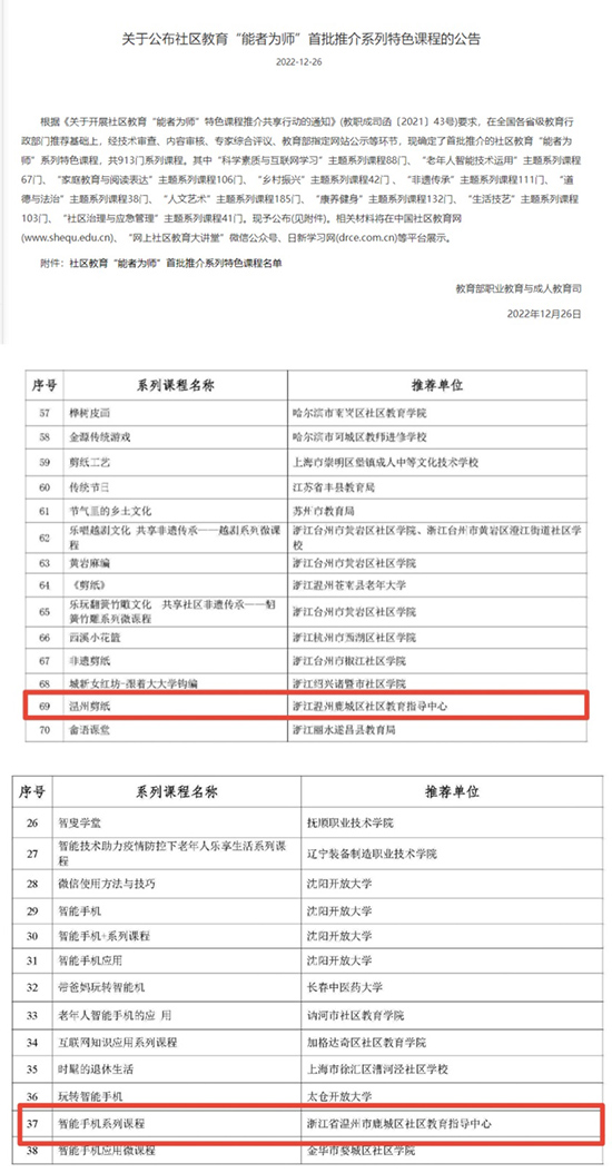 根據《關于開展社區教育“能者為師”特色課程推介共享行動的通知》(教職成司函〔2021〕43號)要求,在全國各省級教育行政部門推薦基礎上,經技術審查、內容審核、專家綜合評議、教育部指定網站公示等環節,溫州市鹿城區社區教育指導中心單溫克老師的《溫州剪紙》、吳麗華老師的《智能手機系列課程》兩門課程成功入選教育部首批推介的社區教育“能者為師”系列特色課程。