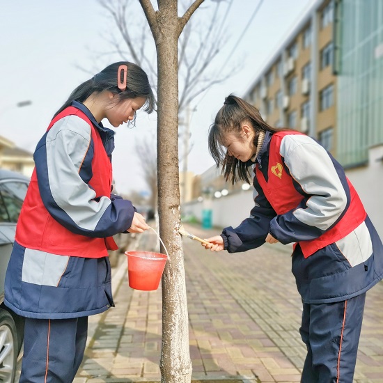 學生分組開展植樹護樹活動,校外的小分隊為街邊的行道樹悉心地涂上保護層,校內的組員們認真地栽下一棵棵樹苗。每一位同學都通過自己的實際行動,為美麗家園、美好生態增添一片新綠,貢獻自己的一份力量。