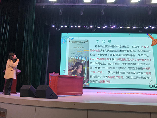 基礎專業部部長裘艷主持并介紹了近幾年考上本科的優秀畢業生。看著大屏幕上學姐學長們一段段自信滿滿、青春洋溢的自我簡介,高三學子心中燃起了對大學的無限憧憬。