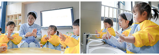 長興縣米樂托育中心教室里歡聲笑語不斷,小朋友們時而伸出小手做著洗手的動作,時而站起來又唱又跳……這是一堂別開生面的洗手小課堂,授課的小老師正是來自湖州衛校的團員志愿者,她們結合日常生活,以圖文、視頻動畫等形式,給小朋友們講解了洗手的重要性、洗手的時刻、手上容易藏細菌的部位和正確洗手的方法。隨后,志愿者將“七步洗手法”編唱成兒歌,以輕松活潑的方式教小朋友們如何正確洗手,小朋友們邊唱邊學,現場氣氛熱烈。