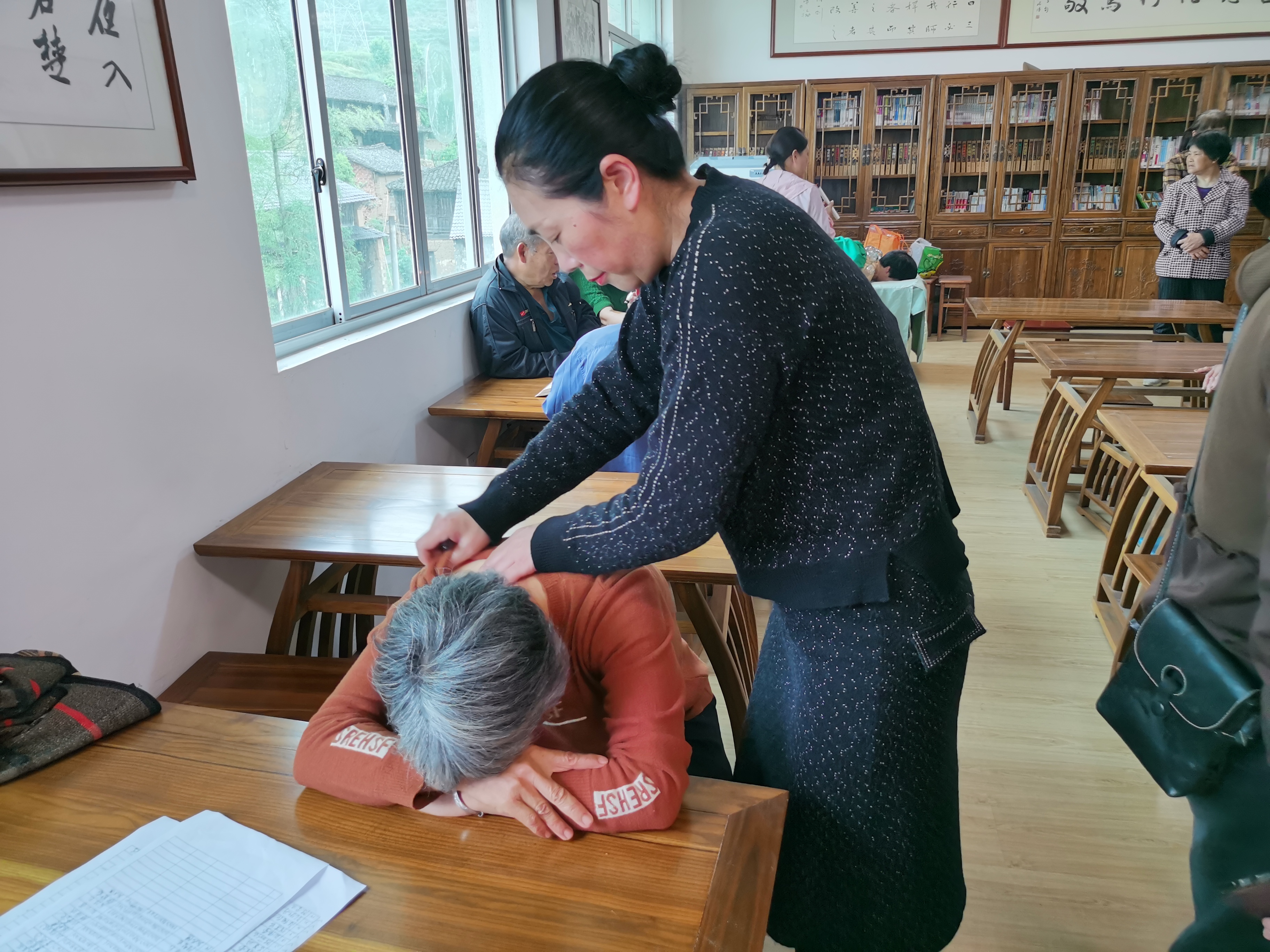 6月6日下午,大盤鎮(zhèn)禮濟村文化禮堂一派熱鬧景象,30多位老人圍在兩位授課老師身邊,享受愛心健康服務。