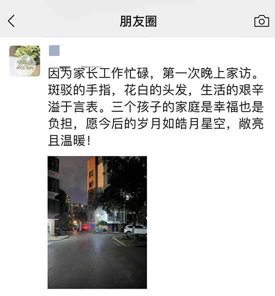 “因?yàn)榧议L(zhǎng)工作忙碌,第一次晚上家訪(fǎng)。斑駁的手指,花白的頭發(fā),生活的艱辛溢于言表。三個(gè)孩子的家庭是幸福也是負(fù)擔(dān),愿今后的歲月如皓月星空,敞亮且溫暖!”8月26日晚,剛剛結(jié)束家訪(fǎng)的浙江省湖州藝術(shù)與設(shè)計(jì)學(xué)校沈曉飛老師在微信朋友圈分享了家訪(fǎng)后的動(dòng)情感悟。無(wú)獨(dú)有偶,學(xué)校計(jì)旭霞老師也在家訪(fǎng)心得體會(huì)中記錄下小張父親的嘆息和對(duì)家庭教育指導(dǎo)的迫切需要。