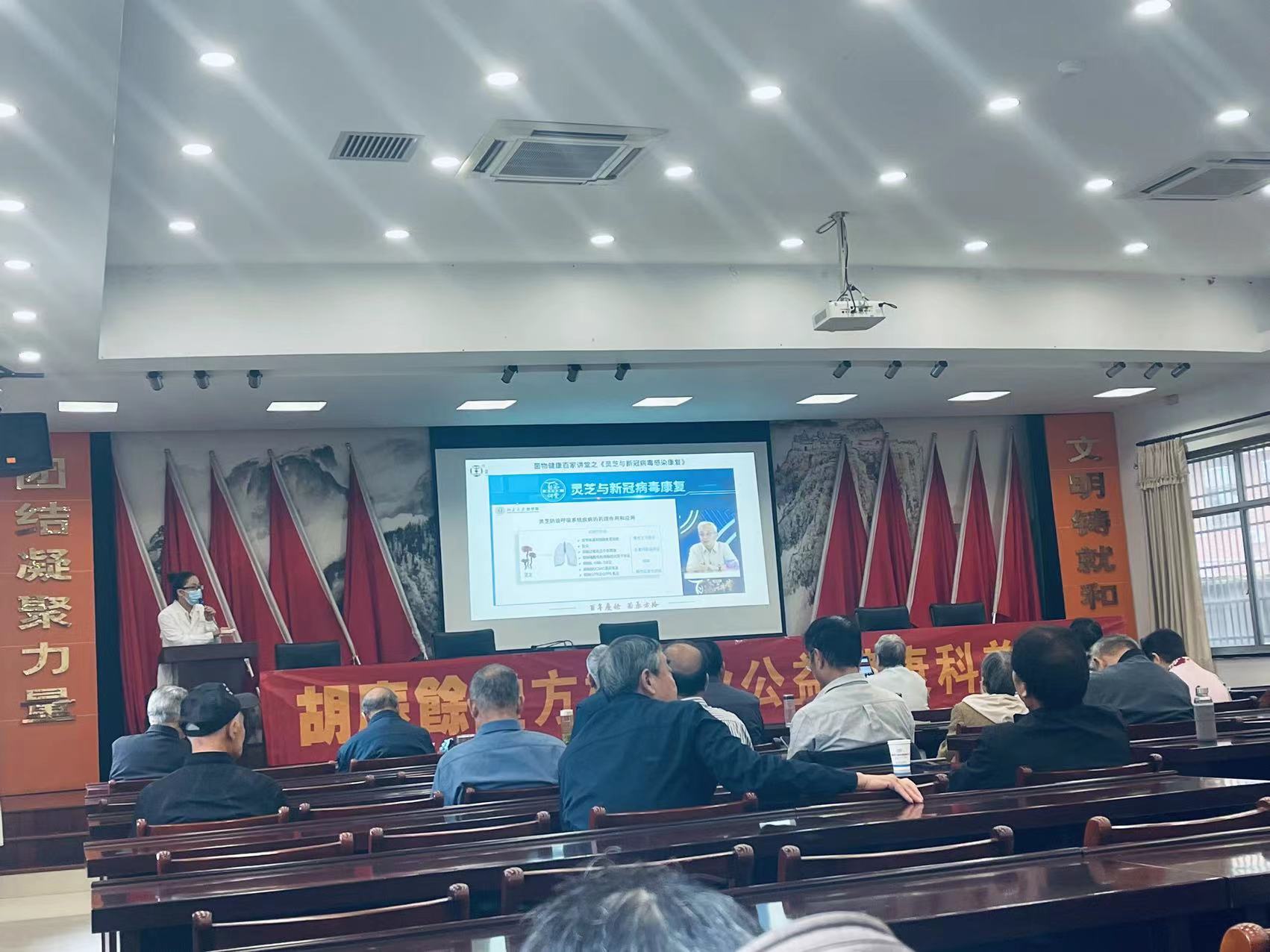 卓越還講述“免疫系統如何保護機體”以及“免疫系統過高和過低”所產生的危害。從中引出《本草綱目》靈芝性平、味甘,有“益心氣、補肝氣、益腎氣、益肺氣、益脾氣、安精魂、堅筋骨、好顏色、增智慧”等諸多功效,著重介紹靈芝抗病毒作用。最后,為在場的老年人送上美好祝福。課后,卓越接受現場咨詢,對大家提出的疑問一一作答。