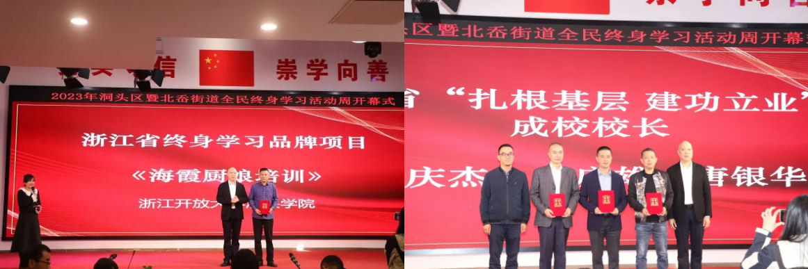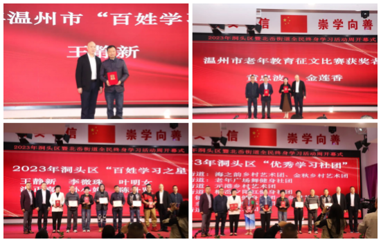 開幕式活動上,還表彰了2023年浙江省終身學習品牌項目《海霞廚娘培訓》、浙江省“扎根基層 建功立業(yè)”成校校長、溫州市“百姓學習之星”、溫州市老年教育征文比賽獲獎?wù)摺⒍搭^區(qū)“百姓學習之星”、洞頭區(qū)“優(yōu)秀學習社團”等,集中展示終身教育發(fā)展成果。