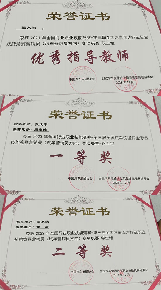 12月3日,2023年全國行業職業技能競賽—第三屆全國汽車流通行業職業技能競賽營銷員(汽車營銷員方向)賽項決賽在重慶圓滿收官。嵊州市職業教育中心代表隊的張義軍校長被評為優秀指導教練,周豪波老師獲教師組全國一等獎,21汽車營銷班的童潔同學獲學生組全國二等獎。