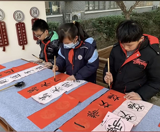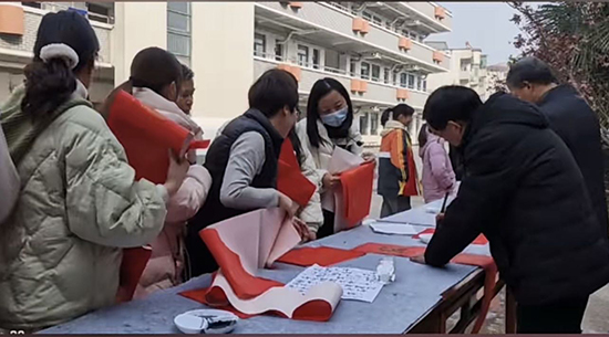 三賢廣場上,擺起一張張書法桌,一幅幅筆墨俱全,一條條紅色條幅鋪著。師生們一見這架勢,紛紛從辦公室、教室走出來,聚集到廣場中來。書法家們見師生們都圍聚過來,立馬鋪開紅紙,拿起毛筆,飽蘸濃墨,凝神靜氣,龍飛鳳舞起來,不一會(huì)兒,不同字體、風(fēng)格迥異的“福”字跳躍在紙上,有剛勁雋永的,有端莊大氣的,有靈活舒展的,有清新秀麗的……字到、福到,意義深遠(yuǎn),飽含對(duì)新年的期盼和祝福。“龍騰華夏國興盛 福降神州民壽康”“龍騰盛世千家喜 春滿神州萬物榮”等對(duì)聯(lián)躍然筆下,大多歌頌繁榮富強(qiáng)的祖國,頌揚(yáng)美好幸福的生活,讓圍觀的師生驚喜不斷;師生們見到自己心儀的“福”字與春聯(lián),不待墨干就爭搶在手里,樂滋滋地保存起來。