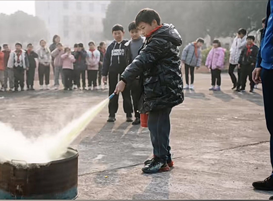 來到學校大道上。消防員拿著滅火器講解并示范使用,之后又給學生們普及了必要的消防知識。