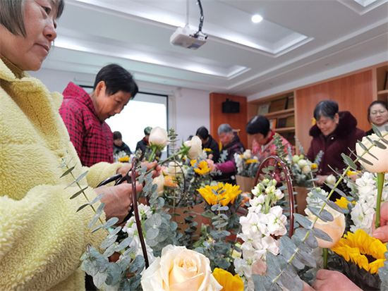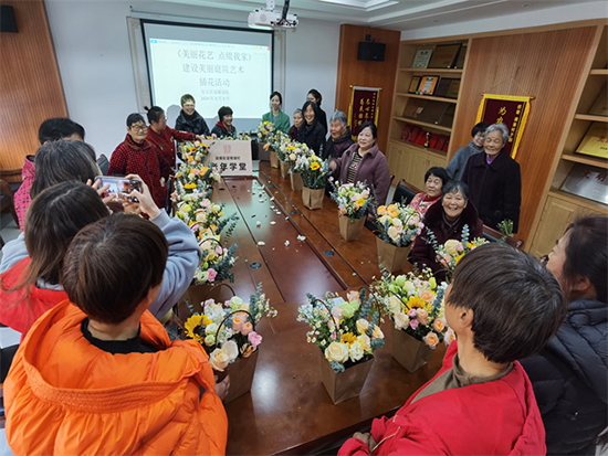 一位90多歲的奶奶開心地說:“沒想到,我這么大年紀了,還有機會參與免費插花活動,謝謝老師們的付出。”