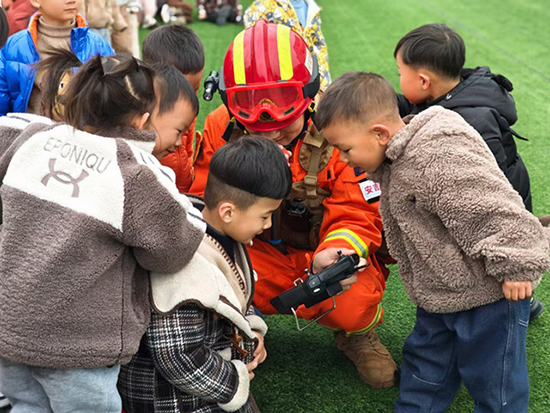 上午9時,在幼兒園的校園里,縣森林消防隊(duì)安全員桂杭鋒帶領(lǐng)6名隊(duì)員在一輛森林消防車前向孩子們邊講邊演示森林滅火裝備,還讓孩子們嘗試著背起水帶背包,看到了夜間模式下開啟使用熱點(diǎn)搜索的無人機(jī)影像。孩子們感覺非常新奇,興趣濃厚。