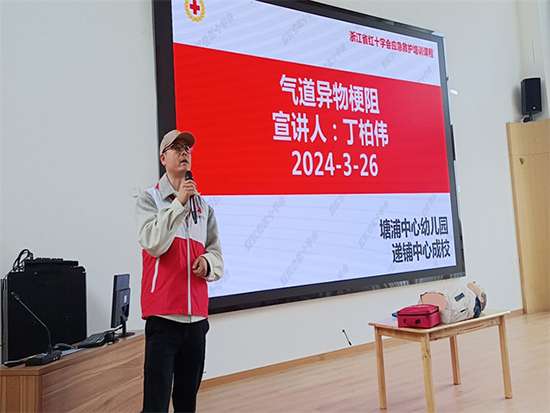 3月26日,安吉縣社區(qū)教育學(xué)院遞鋪分院組織開展急救知識(shí)進(jìn)校園活動(dòng),邀請安吉紅十字會(huì)的丁柏偉老師授課,來自安吉縣塘浦幼兒園的80多位教師參加培訓(xùn)。