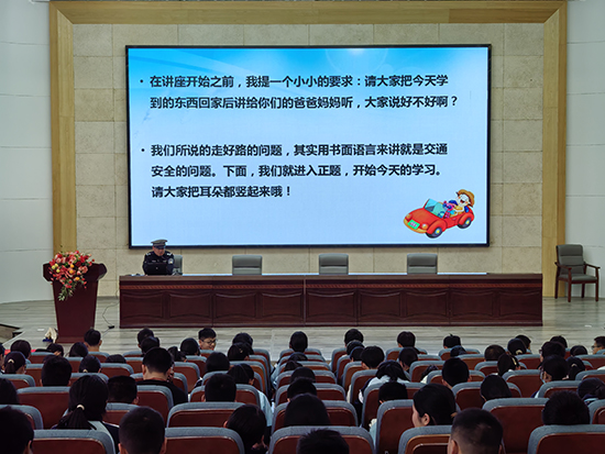應利輝從道路交通事故嚴峻的形勢說起,指出“從小養成遵守交通法規、文明出行的良好習慣”是非常必要的,請求學生“把今天學到的東西回家后講給你們的爸爸媽媽聽,大家說好不好???”得到異口同聲果斷的回答“好!”