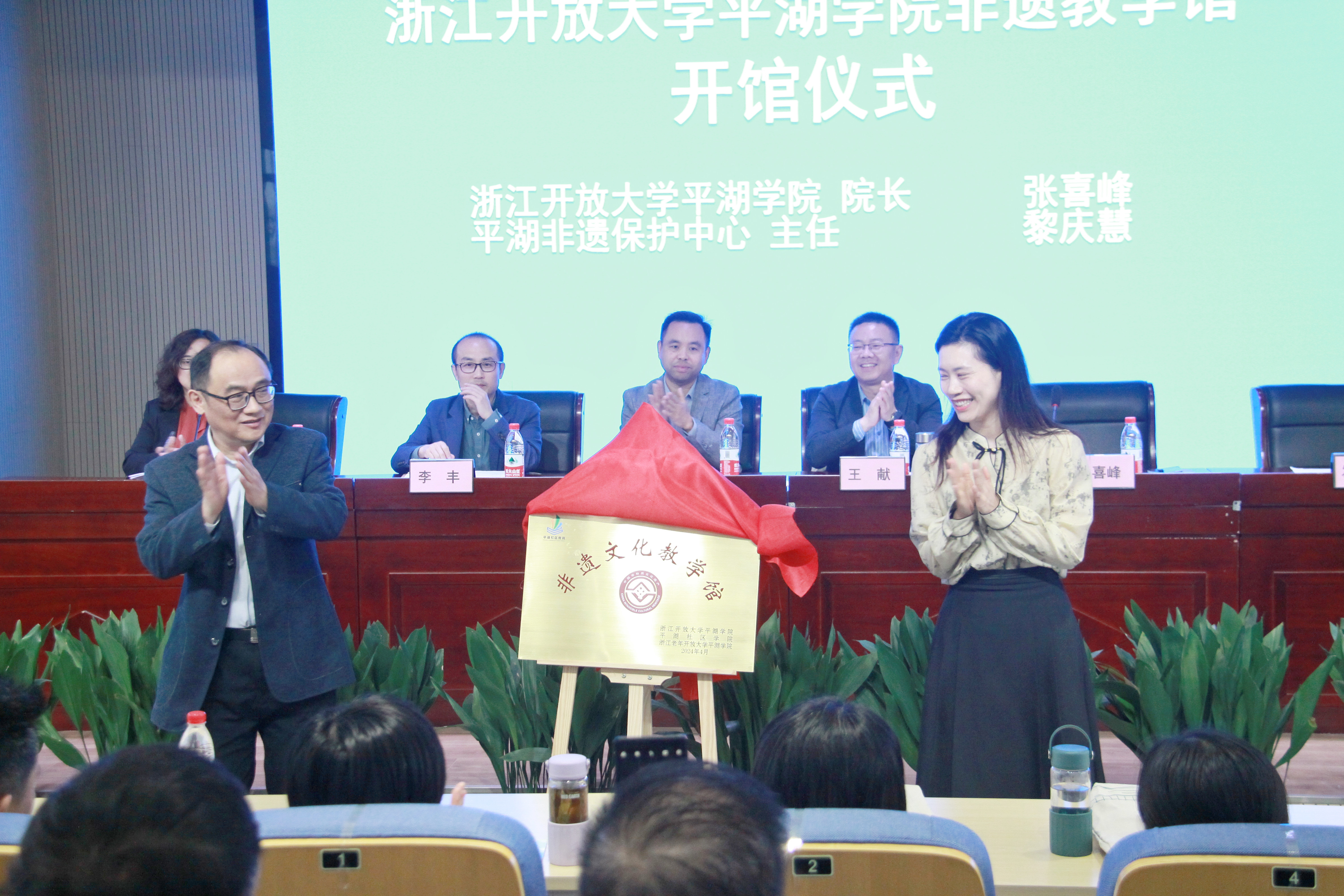 為讓平湖地方特色非遺傳統(tǒng)文化更好地走進社區(qū)教育課堂,加深市民對非遺文化的認識和理解,厚植“家門口”的地方特色文化(非遺)傳承,近一年來開放大學(xué)平湖學(xué)院積極籌建非遺教學(xué)館。院長張喜峰和非遺中心主任黎慶慧為“非遺文化教學(xué)館”揭牌。