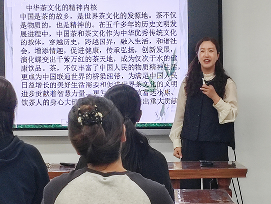 生活茶藝班由茶文化傳承名師工作室負責人呂美萍老師領銜主講《中國茶的精神世界》,國家高級茶藝技師吳玉梅和吳蓮蓮老師主講:如何泡好一杯家鄉茶,茶+N無限可能,仿宋點茶。學員們不僅了領略中國茶的精神世界和茶與健康的緊密聯系,還學習了生活茶的沖泡技巧、現代調飲茶的藝術,體驗了宋代點茶的傳統魅力。在眾多學員中,有一個非常特別團隊——以潘益東和揭艷紅夫妻為首的5人學習小組。盡管他們夫妻倆身有殘疾,但求學精神卻十分堅韌。他們用自己的抖音號把家鄉茶作為大眾口糧茶推銷出去,決定親自走進課堂,深入學習茶文化的精髓。