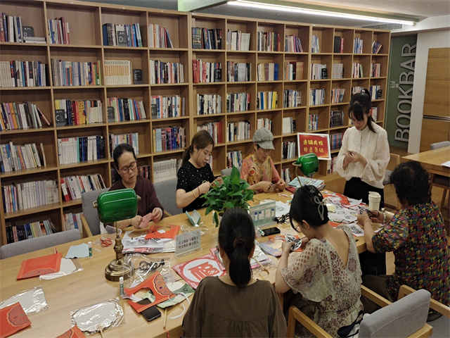 蔣娟老師向大家展示了自己制作的手工剪紙團(tuán)扇,學(xué)員們信心大增,也想要做一把漂亮的團(tuán)扇。隨后,蔣娟老師把準(zhǔn)備好的材料包分發(fā)給大家,一邊示范,一邊教授學(xué)員們利用廢舊紙張剪出喜歡的造型,再貼在空白團(tuán)扇上。