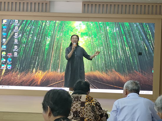 《歌伴舞:前門情思大碗茶》,具有濃郁的老北京風情,以優美動聽的旋律,婀娜動人的舞姿,讓在座的老年人樂開懷。《越劇:金玉良緣》,是老年人的最愛,這唱詞太熟悉,百聽不厭。當演員“林妹妹,你身子好了沒有 ……”一出口,臺下馬上有人附和,不同聲音互相應和。盡管腔調不同,唱腔缺少純正、圓潤,但是內容一致,與臺上融成一體,臺上臺下其樂融融。歌曲、舞蹈一個接一個上,盡管不是專業演出,也不是專門的舞臺,設施設備也相當簡陋,但演員們的表演是真誠的,把自己最好的一面展現出來,老人們對演出的一個個節目都很喜歡,報以熱烈的掌聲。