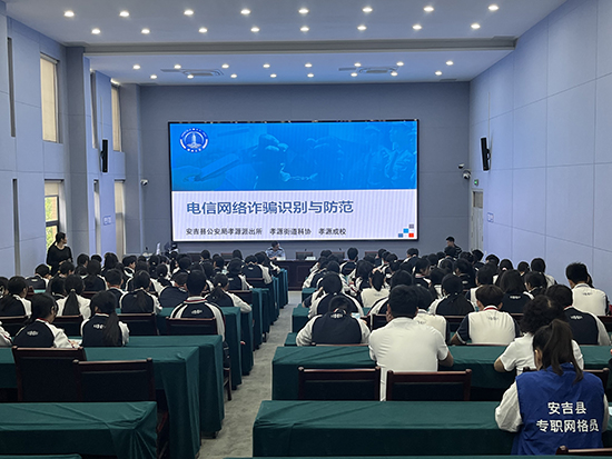 活動邀請安吉縣公安局孝源派出所警官張連漢作主題為《電信網絡詐騙識別與防范》專題講座。他從電信網絡詐騙的共同特征講起,講到了電信詐騙的危害等內容,并將今年以來的電信詐騙案件等實際案例進行通報以起到警示作用。