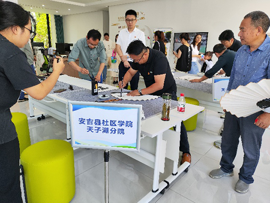 互動結束后,由天子湖分院邀請的安吉書畫協會會員劉云林老師及周金華老師為活動現場“添磚加瓦”,只見劉老師揮動手中的墨筆,一筆一畫地勾勒著,不一會兒功夫,一幅靈活靈現的蓮花畫就映入眼簾,并在畫上題上“出淤泥而不染,濯清漣而不妖”。隨后,周老師也緊跟其后,在折扇上為在場的各單位代表題上詩句。