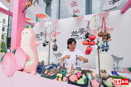 活動當天有很多關于水蜜桃主題的展位,蘭亭成校蘭彩拼布共富工坊展位也在其中,展臺上擺放著用拼布手藝縫制的水蜜桃,和原創水蜜桃環保袋,以及一些拼布的小手工作品,吸引了很多游客的駐足觀賞,水蜜桃的拼布工藝品甚至可以以假亂真,小朋友們都愛不釋手。