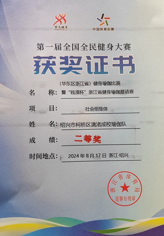 8月16日至18日,第一屆全國全民健身大賽(華東區浙江省)健身瑜伽比賽暨浙江省健身瑜伽邀請賽在紹興市柯橋區錢清街道舉行,賽事吸引來自華東地區各省、市的23支隊伍參加。柯橋區漓渚成校瑜伽隊參賽榮獲集體項目二等獎。
