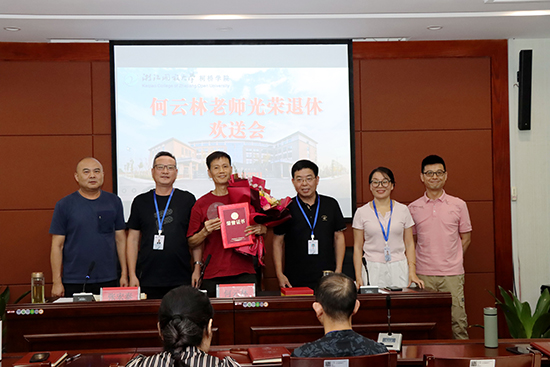 榮退儀式上大家集中觀看了何云林老師教育生涯的回顧短片,周立軍為何云林頒發了退休證、贈送“榮休紀念”牌匾和鮮花。與會老師紛紛發言,表達對何老師的歡送離別之情,大家回憶了與何老師共事的點點滴滴并對何老師送出了美好的祝愿,并在一樓廣場集體合影留念。