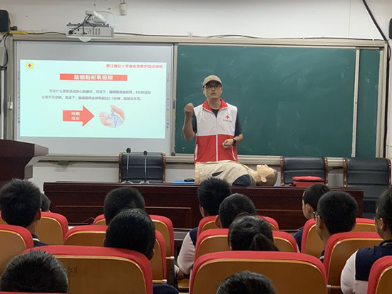 “心搏驟停一旦發(fā)生,如得不到即刻地?fù)尵葟?fù)蘇,4~6分鐘后會造成患者腦和其他人體重要器官組織的不可逆的損害,超過10分鐘則基本喪失生還希望。如果你能熟練掌握急救知識,就有可能及時挽救身邊親人的生命。”丁柏偉老師感慨地說道。接著,丁老師舉了一些現(xiàn)實中因心搏驟停不能得到及時、正確的心肺復(fù)蘇而失敗的實例,一個一個鮮活生命消失,讓人心痛。緊接著,丁柏偉老師講了如何正確判斷心搏驟停、心肺復(fù)蘇的三種基本急救技巧、心肺復(fù)蘇術(shù)的基礎(chǔ)生命支持(BLS)的程序三項內(nèi)容,同學(xué)們聽得很認(rèn)真,時不時還拿起筆記下重點。最后,丁老師講解了心肺復(fù)蘇急救法的操作流,讓同學(xué)們記住按壓的方法和步驟,還讓部分同學(xué)上臺進行演示。這些實用的知識猶如一把把鑰匙,為同學(xué)們打開了守護生命的大門。本堂課丁老師以輕松活潑、通俗易懂的方式,將專業(yè)的急救知識傳授給在場的全體師生,現(xiàn)場學(xué)習(xí)氣氛濃烈。