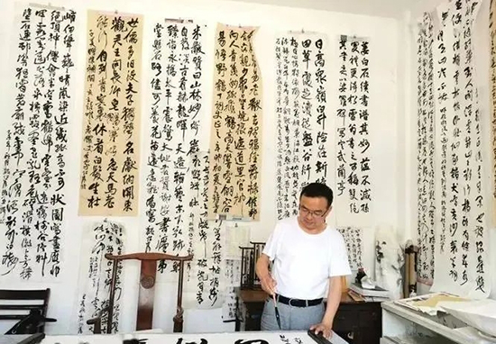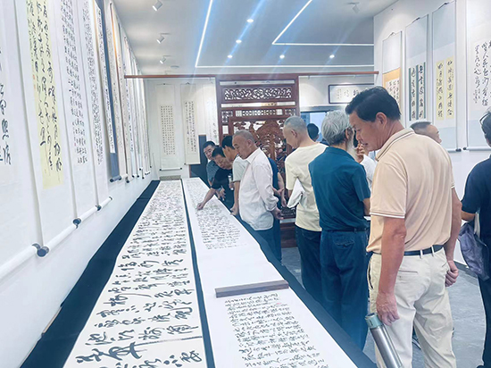 近200位來自諸暨市楓江書畫社、諸暨三賢研究會、諸暨市古越書畫院的社員和書法愛好者及親朋好友觀展,近距離欣賞魏仁虎的書法作品。四周墻壁上掛滿了大大小小尺幅、真草篆隸字體的100余幅多種形式的書法作品,條幅、楹聯、手卷、中堂、扇面、條屏等應有盡有,或娟秀的小楷,或恢宏的大字或流暢的行書,滿眼是雅致的書墨氣息,讓人沉浸在粗細筆畫、輕重筆力、疏密空間、濃淡墨味的書法海洋中,尤其是一樓西側擺放在桌子上的兩幅長卷,吸引眾位圍觀賞鑒,對魏仁虎一氣呵成、大氣磅礴、老到嫻熟地書寫贊美有加。