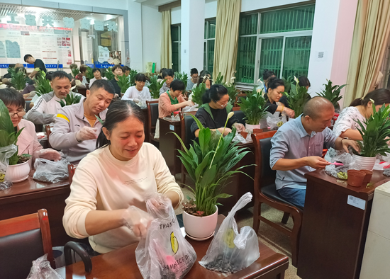 到了實操環節,學員們領取了各類植物材料、花盆、沙土等,大家紛紛手持小工具饒有趣味地種植起來,一邊歡聲笑語,一邊請教老師,填土、搭配,配色、種植……通過近一個小時的培訓,一盆盆有模有樣的盆栽完工。看著呈現在自己面前的一盆盆形態各異、造型可愛的“一帆風順”盆景造型,學員們別提多開心了,(韓紅艷)