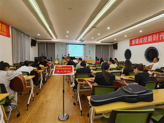 10月13日晚,安吉縣社區教育學院遞鋪分院吉他班演繹自編自創歌曲“夢想再啟航”,來自轄區內各個村、社區的40多位學員參加了本次活動,邀請了湖州市吉他協會的任剛老師授課。