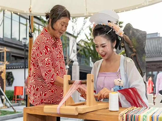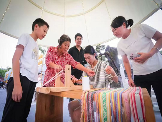 9月22日,安吉縣社區(qū)教育學院孝豐分院章村學習中心助力兼職教師朱越蘭在湖州市吳興區(qū)小西街沿街設攤,舉辦了一次別開生面的畬族彩帶編織技藝傳授活動。