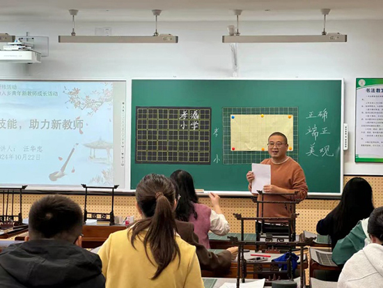 10月28日下午3時,安吉縣社區教育學院孝源學習中心和安吉縣實驗小學教育集團孝源校區聯合舉辦的“習字強技能 助力新教師”寫字知識講座在該校區綜合樓三樓書法室開講。