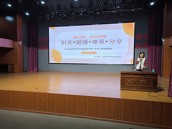 10月31日,安吉縣社區教育學院天荒坪分院邀請安吉縣家庭教育講師、安吉縣第三小學教師程麗霞為安吉縣天荒坪中學初一年級學生帶來“銀杏之約——認識青春期”健康講座,加強學生青春期教育,引導學生正確面對青春期生理心理變化,增強自我保護意識,養成自尊自愛的心理素質,積極健康地生活和學習。