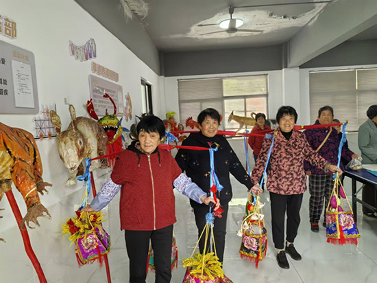 活動現場,指導教師徐清水老師為老人們準備了彩紙、彩帶、顏料、竹篾等活動制作材料,并細致地講解了制作五谷燈的詳細步驟。在徐老師的指導下,老人們饒有興趣地制作起來,扎出美麗的花,編出漂亮的花籃,再按上精致的小扁擔,制作完畢后,老人們互相欣賞彼此的作品,氣氛十分活躍。