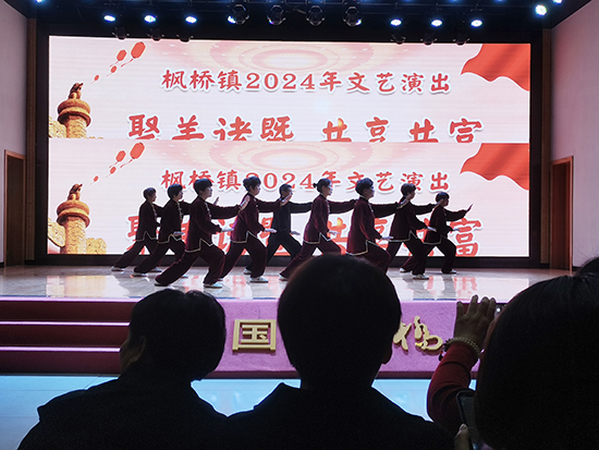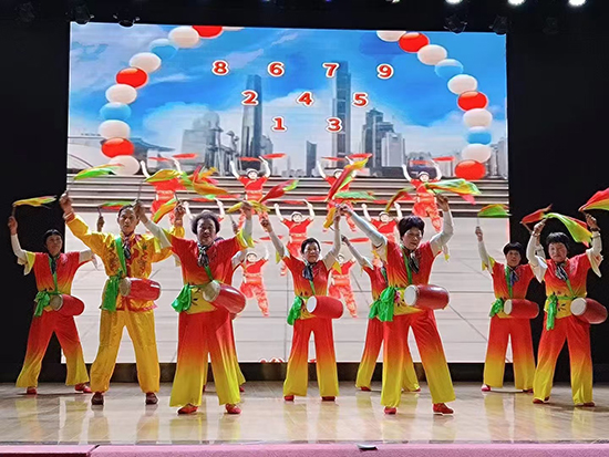 悠揚(yáng)而又喜慶的曲調(diào)響起,越劇聯(lián)唱《五女拜壽》,演員們唱腔圓潤(rùn)、有板有眼地演唱,贏得臺(tái)下觀眾陣陣掌聲和拍照聲,熟悉的臺(tái)詞馬上有觀眾跟著哼唱起來(lái),奠定了晚會(huì)歡樂(lè)的場(chǎng)景。“咚咚咚!咚咚咚!”的聲音響起,《腰鼓舞:張燈結(jié)彩》盛情上演,陣型氣勢(shì)恢宏,樂(lè)曲歡快熱烈,隊(duì)形整齊劃一,服裝靚麗紅火,隊(duì)員間配合默契,活力四射,隨著鼓點(diǎn)的節(jié)奏自如變換一個(gè)個(gè)的隊(duì)形。舞蹈、廣場(chǎng)舞、歌曲、薩克斯演奏,節(jié)目有序上演著。一陣典雅古樸的音樂(lè)傳來(lái),隊(duì)員身著統(tǒng)一的太極表演服,精神抖擻地上臺(tái)演示《太極十六式:紅梅贊》,將手舉起,呈抱拳禮動(dòng)作,“起勢(shì)”,不緊不慢地放下雙手,邁開左腿,連貫而不失節(jié)奏地表演。每位隊(duì)員氣沉丹田,行云流水,一招一式揮灑自如,隨著樂(lè)曲的節(jié)拍,雙手猶如白云一般舞動(dòng)著,動(dòng)作中藏著剛勁,雙手握拳,轉(zhuǎn)腿,向前緩緩沖拳,推掌,精確,到位,整齊,讓人沉醉其中。《爵士舞:最炫反詐風(fēng)》的表演,讓觀眾享受激烈的氣氛,“陌生來(lái)電需警惕,核實(shí)清楚莫大意”“網(wǎng)絡(luò)詐騙不難防,不貪不給不上當(dāng)”“個(gè)人信息不外傳,陌生電話不輕信”這樣的反詐歌詞令人記憶深刻。勁歌熱舞、激情音樂(lè)掀起了高潮。晚會(huì)在全體演員合唱《沒(méi)有共產(chǎn)黨就沒(méi)有新中國(guó)》中落下帷幕。