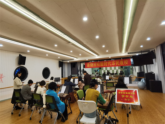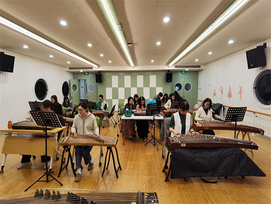 葉雯老師示范地彈奏了一曲,贏得了學員們的陣陣掌聲。學員們在老師的帶領下認識了古箏的結構。從簡單的練習曲目入手,熟悉琴譜。在彈奏古箏的時候雙手要撥動琴弦,眼睛要看琴譜,腦子要思考如何彈奏,這調動了左右腦的協同工作,是對大腦平衡的一種鍛煉,同時也有助于培養注意力的集中。