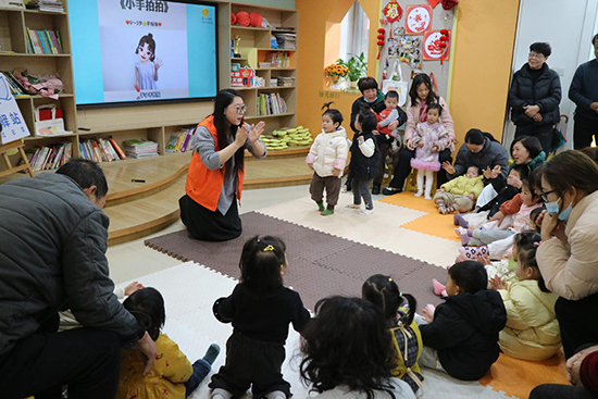 活動(dòng)伊始,家庭養(yǎng)育健康指導(dǎo)員以“我們的小手能做什么?”為引,引導(dǎo)孩子們積極思考,“吃飯”“穿衣”……孩子們爭先恐后地舉手回答,現(xiàn)場氣氛熱烈。隨后,伴隨著歡快的《小手拍拍》兒歌,孩子們或揮舞小手、或藏起小手、或拍拍小手,在律動(dòng)中感受著小手的靈活與力量。