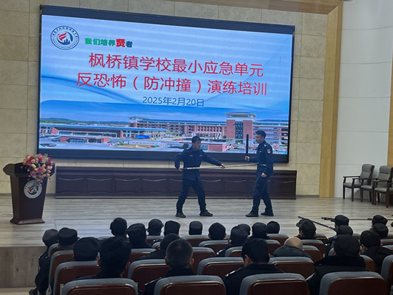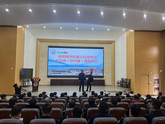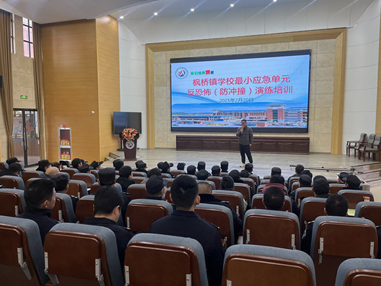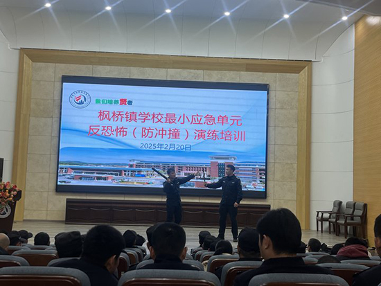 2月20日下午,諸暨市楓橋鎮(zhèn)初級中學的報告廳內(nèi)陸續(xù)走來穿保安制服的人員,原來這里要舉行楓橋鎮(zhèn)中小學、幼兒園安保人員“最小應急單元反恐怖(防沖撞)演練”培訓。