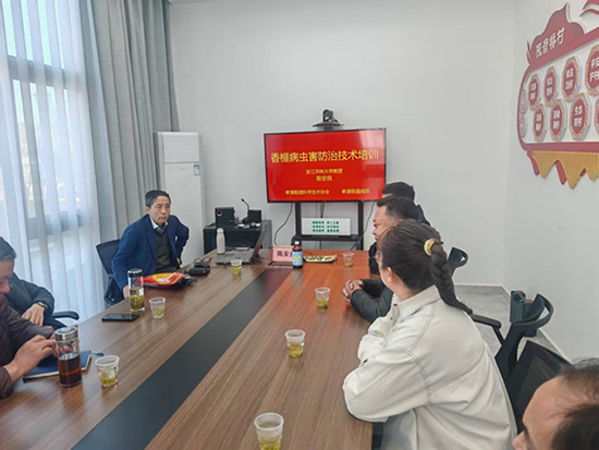“為了今天的培訓和實踐活動,我準備已久。一是將我近三年來對香榧病蟲害防治技術研究成果扎實落地并把這些技術教給今天來的骨干力量,二是到香榧林里去實地查看……”在觀音橋村文化禮堂一樓會議室里,來自浙江農林大學林業與生物技術學院森林保護學科專家陳安良教授正和前來參加香榧種植技術的幾十位農戶學員娓娓道來,接著作了主題為《香榧病蟲害防治技術培訓》的講座,并不時地與參訓學員們互動交流。