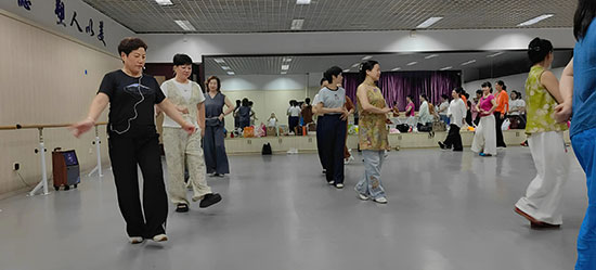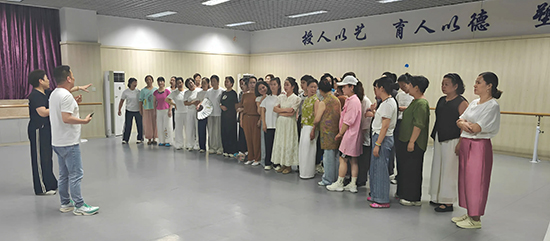 簡短而莊重的開班儀式結(jié)束后,兩位老師便馬不停蹄地投入到了緊張而有序的教學中。她們首先帶領學員進行熱身走步,過程中,兩位老師耐心細致,不放過任何一個細節(jié),親自示范步法與手勢,讓學員們能夠準確掌握每一個動作要領。隨后,根據(jù)學員的特點和自身優(yōu)勢,將學員們巧妙地分為花旦和小生組,進行有針對性的教學。在兩位老師的悉心指導下,學員們迅速進入狀態(tài),全神貫注地認真練習,現(xiàn)場學習氛圍濃厚。不一會兒,學員們便轉(zhuǎn)入了越劇經(jīng)典劇目《打金枝·闖宮》的排練中。大家各展風采,將越劇的韻味展現(xiàn)得淋漓盡致,現(xiàn)場氣氛熱烈而有序,仿佛一場精彩的越劇盛宴正在徐徐拉開帷幕。