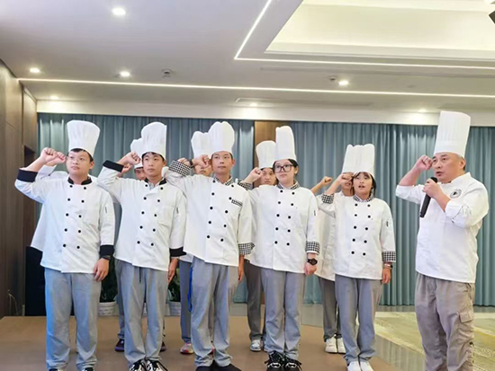 隨后,烹飪專業教師陸志方帶領全體學生莊嚴宣誓,明確職業使命,承諾恪守職業道德,追求技藝精進,弘揚飲食文化,將個人發展融入行業進步,努力成為行業標桿。誓言充滿了學生們對烹飪事業的敬畏與追求,也標志著他們正式邁出職業成長的重要一步。