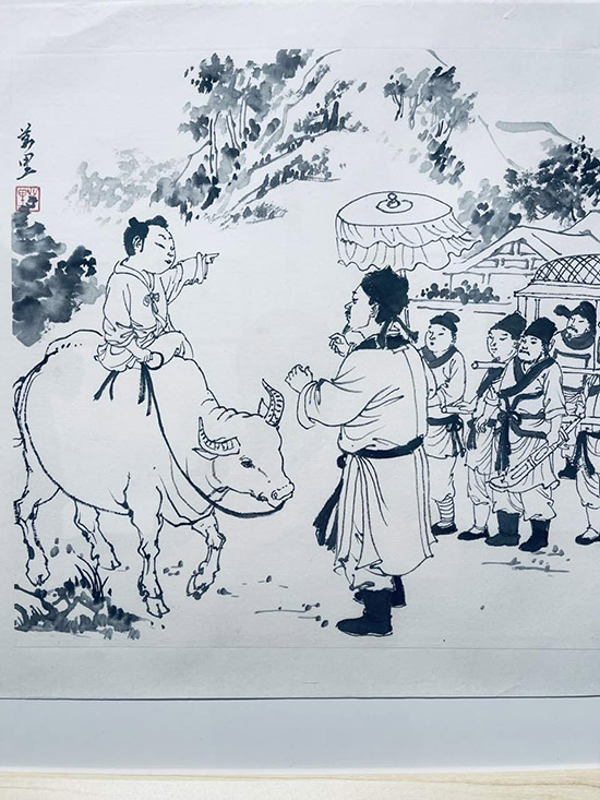 洪萬里以“楓橋三賢”——王冕、楊維楨、陳洪綬三位歷史人物為創(chuàng)作切入點(diǎn),深得陳洪綬(號(hào)老蓮)遺風(fēng)。其筆下的羅漢、八仙、達(dá)摩、和合二仙等人物畫,嫻熟運(yùn)用陳洪綬所創(chuàng)“高古游絲描”,線條圓潤細(xì)勁、流暢連綿,如春蠶吐絲,盡顯古拙金石韻味。他以傳統(tǒng)筆法勾勒人物,形制高古奇駭,衣紋流轉(zhuǎn)自如,在傳承傳統(tǒng)白描精髓的同時(shí),融入現(xiàn)代審美意趣,實(shí)現(xiàn)了古典題材與當(dāng)代藝術(shù)精神的對(duì)話。畫作將地域名人故事與紅色文化娓娓道來,展現(xiàn)出深厚的文化底蘊(yùn)與非凡的藝術(shù)創(chuàng)造力,既是對(duì)歷史的致敬,也是對(duì)人文精神的當(dāng)代重構(gòu)。