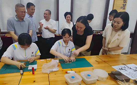 9月24日下午,省文聯黨組成員、書記處書記曹鴻一行蒞臨瑞安市職業中等專業教育集團學校(瑞安市錦湖社區學校),專題調研非遺項目進校園的傳承與發展工作。溫州市文聯副主席王黎然,中共瑞安市委常委、宣傳部部長鄒霜雙,市委宣傳部副部長、電影局局長金鎧,市文聯黨組書記、主席陳安力,市民間文藝家協會會長林良爽,以及學校校長謝炳沖、錦湖社區學校常務副校長張再益等陪同調研。