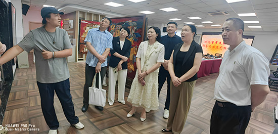 在漆器漆藝傳承工作室,青年漆藝藝術家、瑞安市技能大師工作室負責人韓正鑫向調研組介紹了瑞安漆藝的悠久歷史及其個人創作心得,并重點解讀了多幅入選全國展覽的獲獎漆畫作品。在學生成果展示區,韓正鑫匯報了依托工藝美術專業,通過選修課、校本教材開發及興趣小組等多種形式開展傳承教育的具體做法。曹鴻對溫州漆藝的精湛技藝表示贊賞,并對青年一代積極投身傳承深感欣慰,鼓勵大家勇擔使命,持續推動漆藝創新發展。針對工作室外部標識不夠醒目的問題,曹鴻等領導建議盡快懸掛“溫州漆鋪”標牌,以增強品牌識別度。