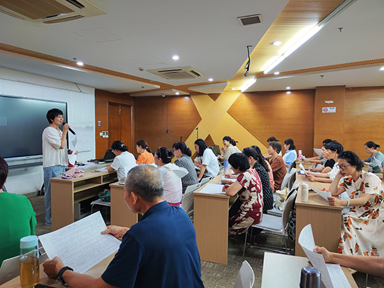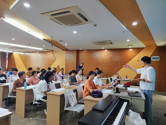 課程伊始,吳老師先讓學(xué)員們進(jìn)行自我介紹、互相認(rèn)識,有基礎(chǔ)的學(xué)員還哼上幾句越劇,讓老師把把關(guān)看看基礎(chǔ),也惹得學(xué)員們開懷大笑,大家在歡聲笑語中破冰。本次課吳老師教的是《何文秀—心連心選段》,吳老師從基礎(chǔ)唱腔入手,逐字逐句指導(dǎo)學(xué)員把握音準(zhǔn)與節(jié)奏,同時示范經(jīng)典身段動作,如蘭花指、臺步等,耐心糾正細(xì)節(jié)姿勢。學(xué)員們神情專注,手持曲譜認(rèn)真跟練,時而輕聲哼唱,時而模仿身段,遇到疑問及時向老師請教,互動氛圍熱烈。