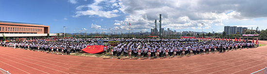 莊嚴(yán)的升國旗儀式,全場師生肅立,向國旗行注目禮。