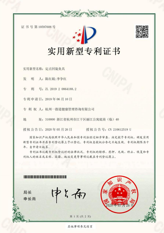 她勤修內(nèi)功,加快推進古法艾灸的創(chuàng)新發(fā)展,有意識地進行傳統(tǒng)醫(yī)藥知識產(chǎn)權(quán)的保護。筧橋古法艾灸項目以祖?zhèn)靼瑮l配方、百字銘文、扶陽固本“四部灸法”和特色專用灸具為主要特色其中秘制大艾條是核心技藝的重要載體,成為筧橋古法艾灸的立足之本。陳紅娟懷著“抱元守一的思想(“元”指古法艾灸,“一”則是仁愛之道),經(jīng)過多年的專業(yè)學(xué)習(xí),為大眾的養(yǎng)生之道研究新的路徑,目前已全面掌握 5 根大艾條的配方、古法制作技藝和辨證施治要領(lǐng),并在祖?zhèn)鞣鲫柟瘫?ldquo;四部灸法”的基礎(chǔ)上,針對人體不同部位的經(jīng)絡(luò)走勢,不斷拓展灸法的實踐。現(xiàn)研發(fā)推出的主要產(chǎn)品有:扶陽大艾條、至尊灸條、寶寶艾、防疫細艾、貴妃灸條等,并已成功申報注冊商標“筧橋古法”“一指道”“杭十八”“南宋御艾”和“宋韻江南”;針對艾灸操作費力費時、過量艾煙污染環(huán)境關(guān)鍵技術(shù)設(shè)備落后等問題,進行針對性的技術(shù)攻關(guān)成功研制并申請實用新型專利“定點回旋灸”和外觀設(shè)計專利“艾灸儀”;拓展衍生產(chǎn)品艾草膏、艾草浴包、艾尖茶、艾草暖貼、艾草枕、艾草香品等若干。考慮“五根大艾條”之一的“扶陽灸”(又名“扶陽固本灸”)已面世10年,各項技術(shù)要領(lǐng)和實操經(jīng)驗均已成熟,她擴大研發(fā)團隊,建全禪城保護檔案,保護祖?zhèn)髋浞剑貑⑹S嗨母蟀瑮l“駐世灸”“調(diào)神灸”“痿蹙灸”“通體灸”的復(fù)活工作。