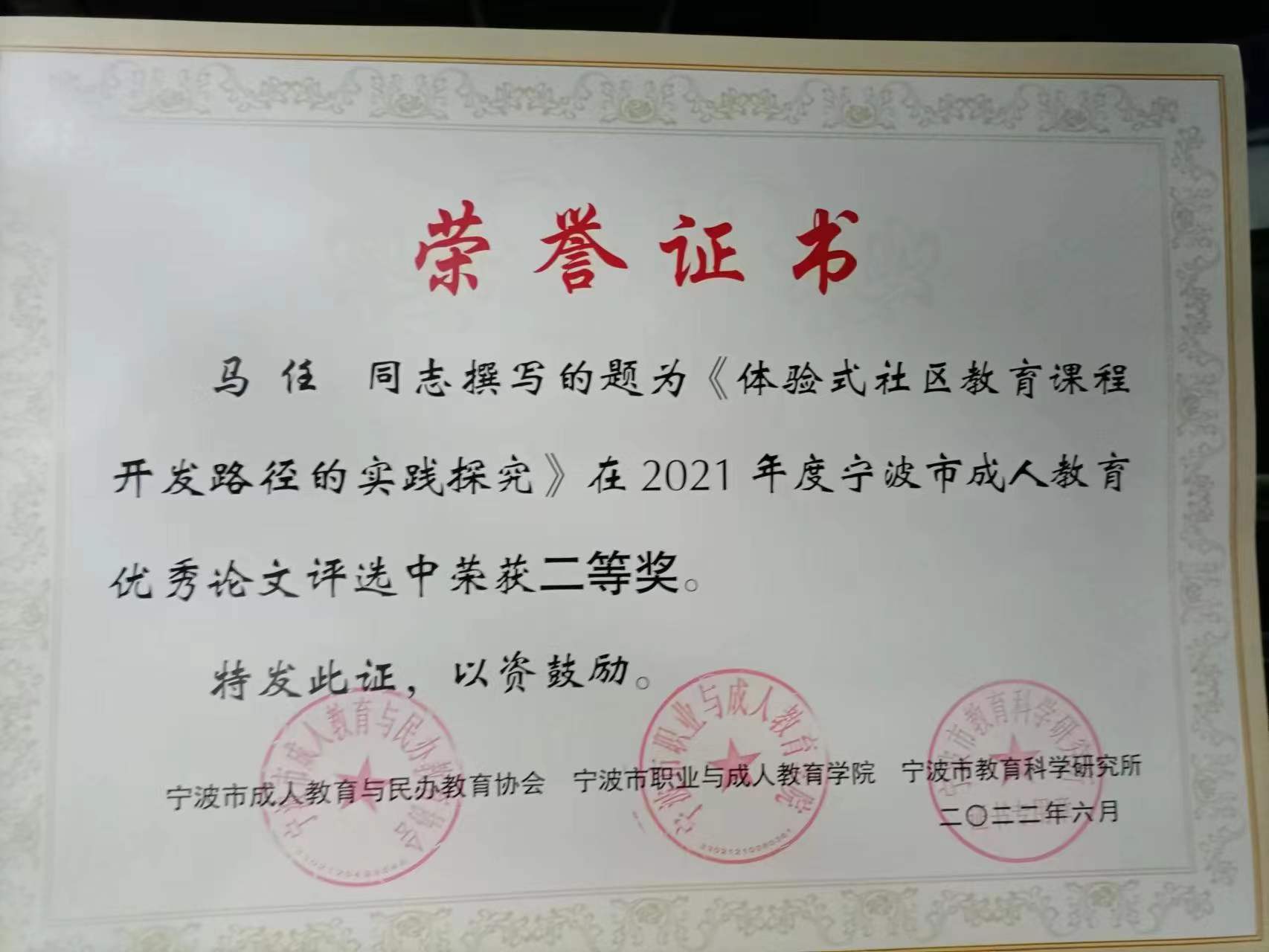 提升了社區教育紅色文化傳播的隊伍素養。以紅色文化體驗課程為素材的論文《用心、用情,挖掘身邊教育資源》獲得寧波市社區教育論文二等獎,課題《體驗式社區教育課程開發路徑的實踐研究》榮獲2021年度寧波市成人教育科研成果二等獎,《新時代背景下紅色文化融入社區教育的實踐路徑》申報成為市級成人教育研究專項課題,目前正在課題實施中,《紅色文化體驗課程建設的實踐》一文發表在“中國社區教育”刊物2023年第6期。