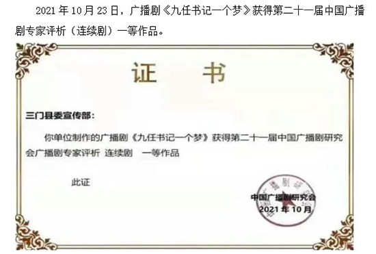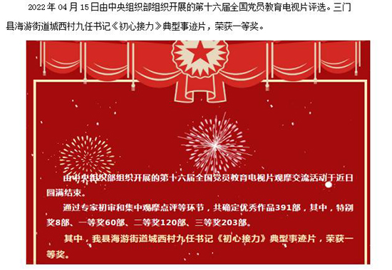 由中央組織部組織開展的第十六屆全國黨員教育電視片觀摩交流活動,講述三門縣海游街道城西村九任書記故事的《初心接力》榮獲全國黨員教育電視片一等獎。海游街道城西村自1957年建立村黨支部以來,九任黨組織書記不忘初心,一任接著一任干,把黨的組織優勢轉化為鄉村治理效能,城西村從“一窮二白”向“村強民富”華麗蛻變,成功打造了新時代黨建引領鄉村振興范本。曾經吃穿都發愁、需要翻身的“翻身村”,成為“浙江省小康示范村”,集體經濟年收入上千萬元,年人均收入8萬多元。2021年建黨100周年,城西村黨委獲評“全國先進基層黨組織”。第九任書記章國進代表村黨委進京領獎,受到習近平總書記等黨和國家領導同志的親切會見并合影留念。