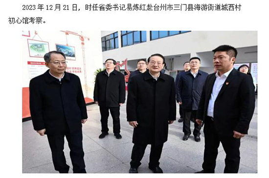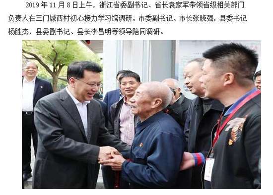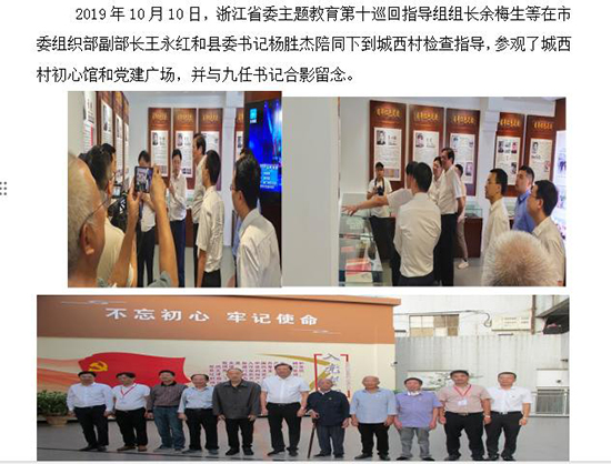 《“初心接力”學習館》被定為浙江省、臺州市、三門縣三級愛國主義教育基地,以及臺州市“跟著紅色地圖學黨史”現場學習教育基地、臺州市初心使命教育基地。隨著深入學習貫徹習近平新時代中國特色社會主義思想走入走新,各級單位組織黨員、群眾前來調研考察、參觀指導。自建館來共接待前來省市縣各級考察團共120批次3500人。開展“初心接力”紅色足跡體驗學習活動。2019.11.8,時任浙江省委副書記、省長袁家軍帶領省級相關部門負責人來三門城西村初心館開展調研活動。2023.12.27,時任省委書記易煉紅等領導來城西村初心館,考察了解農村黨組織開展主題教育和黨建引領鄉村振興等情況。2019年10月10日,時任省委主題教育第十巡回指導組組長余梅生等領導到城西村初心館和黨建廣場體驗學習,并與九任書記合影留念。