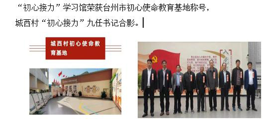 《“初心接力”學習館》積極參與全民終身學習體系的構建,由海游街道社區學校牽頭,以《“初心接力”學習館》為載體,采取傳統文化的傳承與社會服務相結合的方式,服務全民終身學習,到各個社區、文化禮堂、基層黨組織等進行初心接力學習,讓群眾參與初心接力學習體驗,傳承中華民族傳統文化和豐富居民精神生活、提升居民文化自信的雙重價值,也為建設祖國的美好未來貢獻力量,2024年《“初心接力”學習館》獲評臺州市全民終身學習品牌項目。學習館自成立以來,社會影響力不斷擴大,被各類各級媒體多次報道,廣播劇“九任書記一個夢”陸續在中央廣播電視總臺中國之聲、浙江之聲、安徽廣播電視臺新聞綜合廣播、湖北之聲以及學習強國等平臺播出,“榜樣人物”紀錄片在浙江電視臺拍攝播出。2021年在中國共產黨的故事:習近平新時代特色社會主義在浙江的實踐專題宣介會上,城西村第九任書記章國進向全球70余個國家、60多個政黨和政治組織、40多個智庫和友好組織的430多位代表講述城西村九任書記初心接力的故事。新華社、人民日報、浙江日報等多家主流媒體都曾專欄報道“城西村八任書記”的奮斗故事,其中人民日報先后有四次報道,特別是在2021年7月1日致敬中國共產黨成立100周年長篇通訊和2022年9月14日特約評論員文章中把城西村作為典型,分別寫道一個城西小村故事折射出百年大黨的拳拳之心、城西村小康之路折射出中國式現代化取得的輝煌成就。2019年,時任省委書記車俊同志在看到城西村事跡后作出批示:“這是一個基層黨建的好典型,應注意總結、推廣、宣傳”。時任省委常委、組織部長黃建發同志的批示是:“三門縣城西村八任書記事跡感人,可以進一步挖掘,典型事跡可以在第二批主題教育中學習”。臺州市委陳奕君、李躍旗兩任書記也相繼做出了批示。2019年浙江省委“不忘初心、牢記使命”主題教育組織學習城西村八任書記一任接著一任干的先進事跡。時任省委書記易煉紅,時任省委副書記、省長袁家軍同志,現任省委常委、組織部長王成等領導先后蒞臨考察初心館實踐基地,他們有的留詞、題字和講話及合影。他們的鼓勵給了我們力量和信心,也是給我們中華民族的傳統文化注入了自信與活力。 2021年10月23日,廣播劇《九任書記一個夢》獲得第二十一屆中國廣播劇專家評析(連續劇)一等作品。