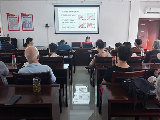 進(jìn)入 “高脂血癥的危害” 講解環(huán)節(jié),朱云老師通過圖文結(jié)合的方式,直觀展示高脂血癥對血管的損害過程 —— 多余的脂質(zhì)沉積在血管壁形成斑塊,如同 “血管里的小石頭”,長期積累會導(dǎo)致動脈粥樣硬化,進(jìn)而引發(fā)冠心病、腦梗死、腦出血等嚴(yán)重疾病。“很多人覺得血脂高沒癥狀就不用管,這是大錯特錯!” 朱云老師強調(diào),高脂血癥被稱為‘無聲的殺手’,早期無癥狀但危害持續(xù),尤其是中老年人、肥胖人群、有家族遺傳史的居民,更要定期檢測血脂。同時,她還分享了高脂血癥的預(yù)防方法,包括控制高油高糖飲食、每周堅持 150 分鐘中等強度運動、戒煙限酒等,建議居民根據(jù)自身情況制定健康管理計劃。